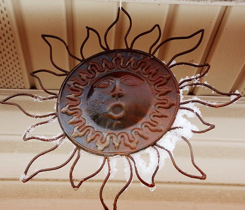Another sun face! For the past eight months I have passed The Concrete Lany which is on the west side of I-65 heading towards Louisville. Totally intriguing place with huge Bears, Rhino's and a large Jesus among various other animals, minerals and vegetables that span several acres! I found the entrance while lost the other day and returned yesterday for a look see. And what did I see? More sun faces!!! This one was so interesting and actually only occupied a corner of a photo that I cropped off. Doesn't it look like a sky of stars in the ceiling of the porch?